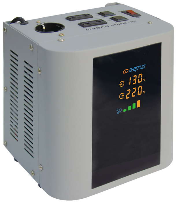 Энергия Нybrid-500 навесной – это стабилизатор напряжения бытового или коммерческого использования. Модель является комбинированной, так как совмещает в себе технологии релейного и сервоприводного типа. Корпус стабилизатора изготовлен из металла, спереди имеется большой, яркий, хорошо читаемый дисплей.