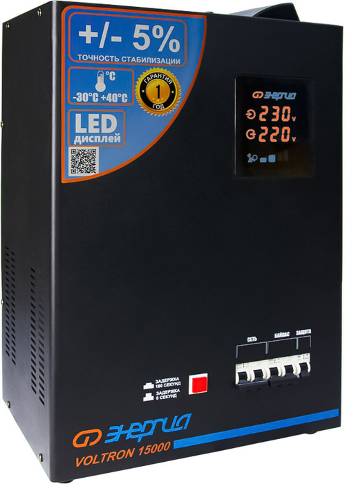 Стабилизатор напряжения Энергия Voltron-15000 обеспечивает точность выравнивания показателей тока до 5%. Универсальная конструкция корпуса позволяет проводить установку на стену или на пол, в зависимости от удобства и свободного пространства. Передняя панель оборудована индикаторами напряжений на входе и выходе.