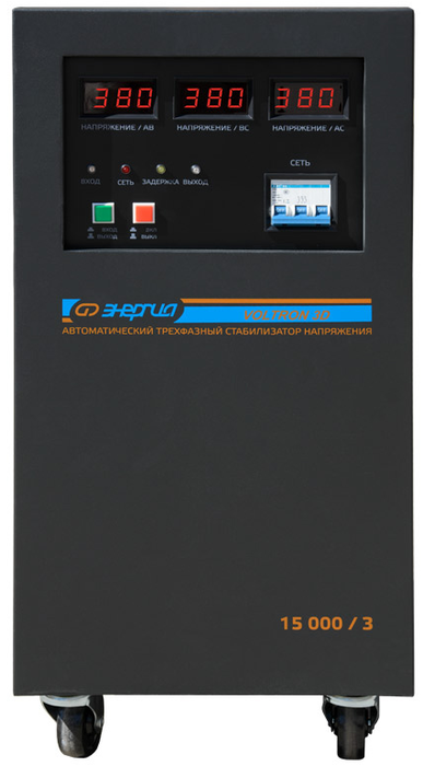 Энергия Voltron 3D 15000/3 – это стабилизатор напряжения из категории электромеханических. Он имеет трёхфазное подключение и работает в широком диапазоне температур от -5 до +40 градусов Цельсия. Стабилизатор рассчитан на прерывное использование, для охлаждения в нем предусмотрен встроенный вентилятор.