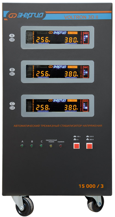 Энергия Voltron 3D II 15000/3 представляет собой безопасный и эргономичный стабилизатор напряжения трехфазного типа. Модель может работать в однофазном и двухфазном режимах. Также есть режим байпас. Для каждой фазы имеется свой информационный дисплей, хорошо читаемый при любом уровне освещенности.