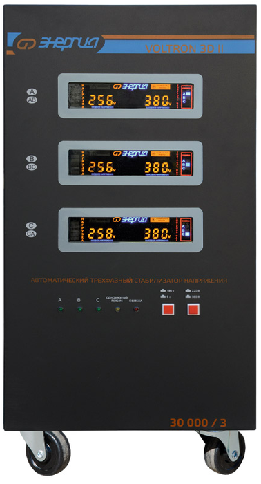 Энергия Voltron 3D II 30000/3 – это автотрансформаторный стабилизатор напряжения с электромеханическим регулированием под управлением сервомотора и соответствующей электронной системы. На передней панели корпуса расположены три дисплея (каждый информирует о состоянии одной из трех рабочих фаз).