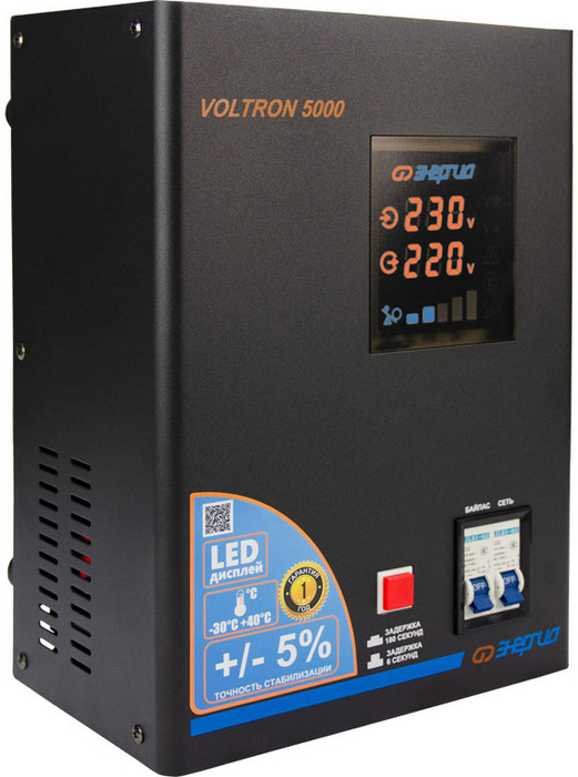 Однофазный бытовой стабилизатор Энергия Voltron-5000 подходит для установки и эксплуатации в помещениях без отопления. Рабочий диапазон окружающей среды находится в пределах от -30 до +40 градусов. Устройство не требует обязательного технического обслуживания — достаточно проводить внешнюю очистку корпуса.