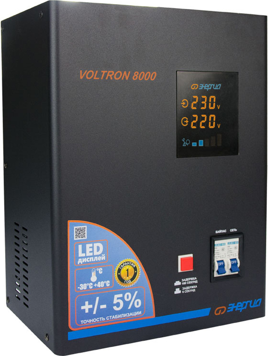 Стабилизатор Энергия Voltron-8000 работает с высокой точностью выравнивания напряжения посредством вольтодобавочной функции. Показатель точности составляет 5%, что позволяет использовать изделие со всеми бытовыми устройствами. Высокая скорость срабатывания на изменения тока способствуют высокой надежности.