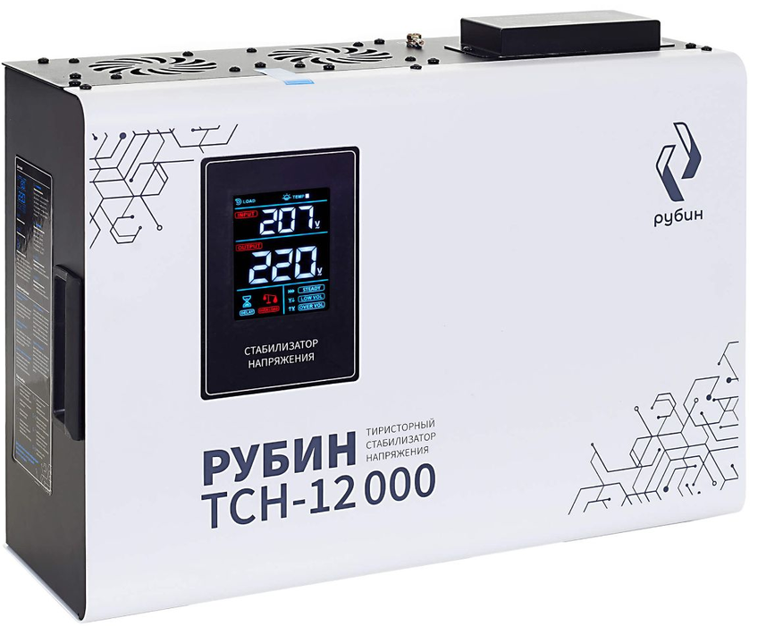 Стабилизатор напряжения РУБИН ТСН 12000 относится к категории тиристорных и подходит только для однофазных электрических сетей. Он выполнен в прочном и компактном корпусе и оснащен ярким ЖК-дисплеем, ан котором отображаются все данные о работе сети, входной и выходном напряжении, нагрузке на оборудование и т. п.