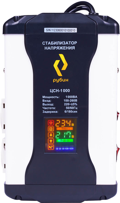 Стабилизатор напряжения РУБИН ЦСН 1000 изготовлен в компактной конструкции для размещения на стене. Устройство работает по релейному принципу и обеспечивает стабильное питание однофазных потребителей в бытовых условиях. Диапазон возможного подключения находится в пределах от 100 до 280В.