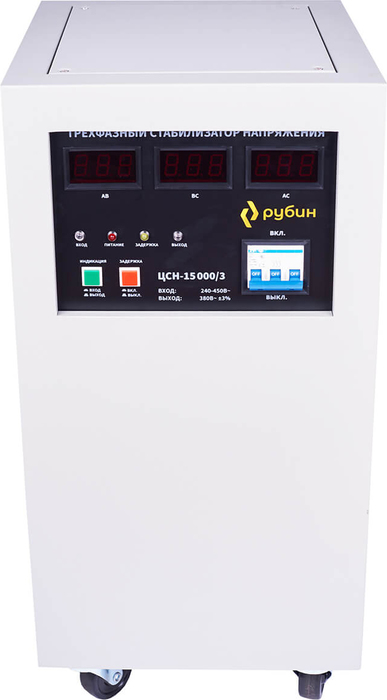 Трехфазный стабилизатор напряжения РУБИН ЦСН 15000/3 выполнен в напольной конструкции с небольшими колесами для перемещения. Воздушное принудительное охлаждение поддерживает комфортную температуру для работы электромеханического устройства. Встроенный байпас улучшает качество эксплуатации.