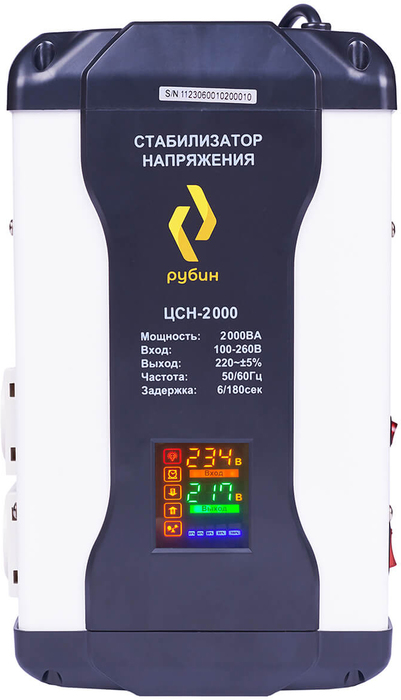 Стабилизатор напряжения однофазный РУБИН ЦСН 2000 оборудован многофункциональным дисплеем на передней стороне. Корпус подходит для настенного монтажа, обеспечивая удобное размещение для контроля показателей и экономию пространства. Рабочая температура устройства находится в диапазоне от -30 до +40 градусов.