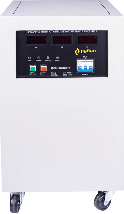Электромеханический стабилизатор напряжения РУБИН ЦСН 20000/3 применяется для трехфазных потребителей с клеммным соединением. КПД устройства достигает 97%. Конструкция установлена на колесные шасси для удобной транспортировки и перемещения. На передней стороны находится дисплей для контроля за работой.