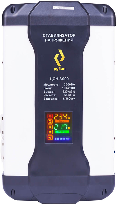 Отечественный стабилизатор напряжения РУБИН ЦСН 3000 подходит для сетей и потребителей с максимальным током в 13 А. Перегрузочная способность изделия составляет 110% не более 60 секунд. Электронная защита от перегрева срабатывает при температуре более +120 градусов. От КЗ защищает встроенный автоматический выключатель.