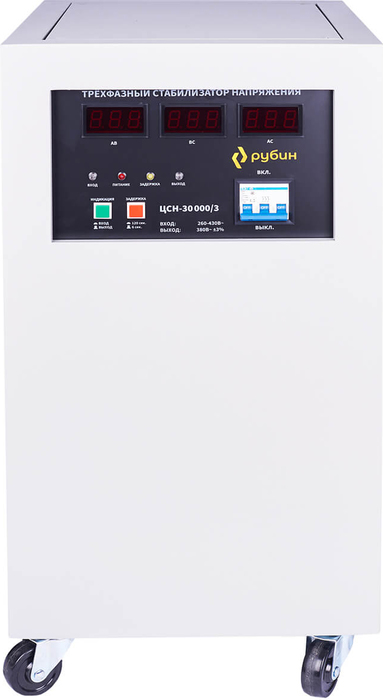 Трехфазный стабилизатор напряжения РУБИН ЦСН 30000/3 изготовлен в напольном формате и оборудован колесным шасси для перемещения. Электромеханический тип обеспечивает надежность, безопасность и стабильность работы как самого устройства, так и подключенного оборудования. Удобное управление за счет наличия дисплея.