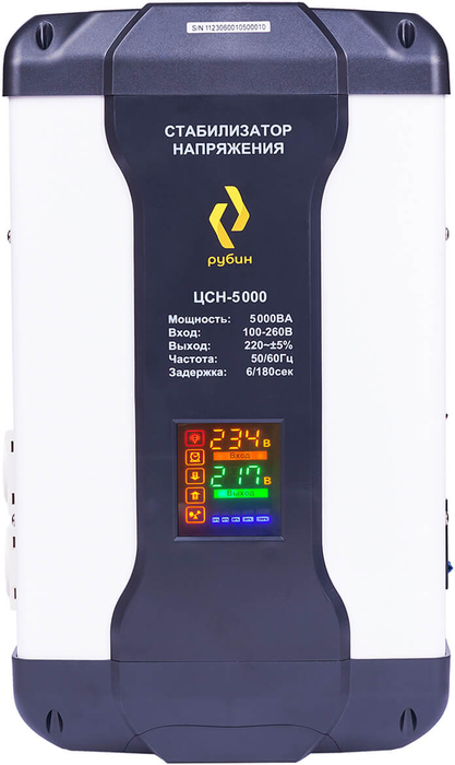 Релейный стабилизатор напряжения РУБИН ЦСН 5000 подключается к потребителям при помощи клеммных колодок. Автоматический выключатель обеспечивает защиту оборудования и людей от короткого замыкания. Дисплей на передней стороне выводит основную информацию для точного контроля за работой устройств.