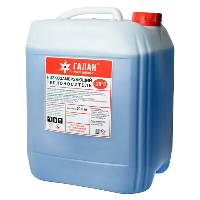 Галан Теплоноситель 20 кг – это универсальный теплоноситель, предназначенный для использования в системах отопления с разными котлами компании Галан: электрическими, твердотопливными, газовыми, дизельными и т.д. Теплоноситель отличается низкой температурой замерзания, поэтому может использоваться в регионах с очень холодными зимами без опасения заморозить отопительную систему. Данная жидкость обеспечивает стабильную работу системы отопления при температуре от -30 до 110 °С. Чтобы сделать работу отопительной системы более стабильной и свести необходимость ее обслуживания к минимуму, производитель добавил в данный теплоноситель присадки против образования коррозии и накипи, причем использование данной жидкости способствует устранение уже имеющейся на стенках теплообменников накипи.