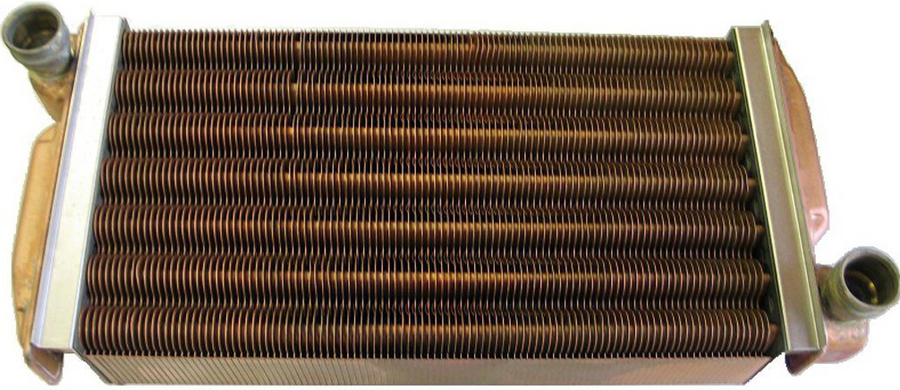 Основной элемент газового котла Protherm (Протерм) Теплообменник первичный (S1037200). Устанавливается в устройства серии Пантера 35 KTV 20. Конструкция представлена в виде медных пластин, которые напаяны на медные трубы. Вся конструкция покрыта защитным слоем силумина, что защищает от высокой температуры и ржавчины.
