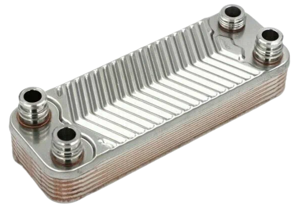 Vaillant (Вайлант) Теплообменник ГВС (12 пласт.) (65088) необходим в газовых котлах. Он позволяет передавать тепло от основного теплообменника к воде, которая затем поступает в систему горячего водоснабжения, достигнув нужной температуры нагрева. Изделие состоит из 12 гофрированных металлических пластин.