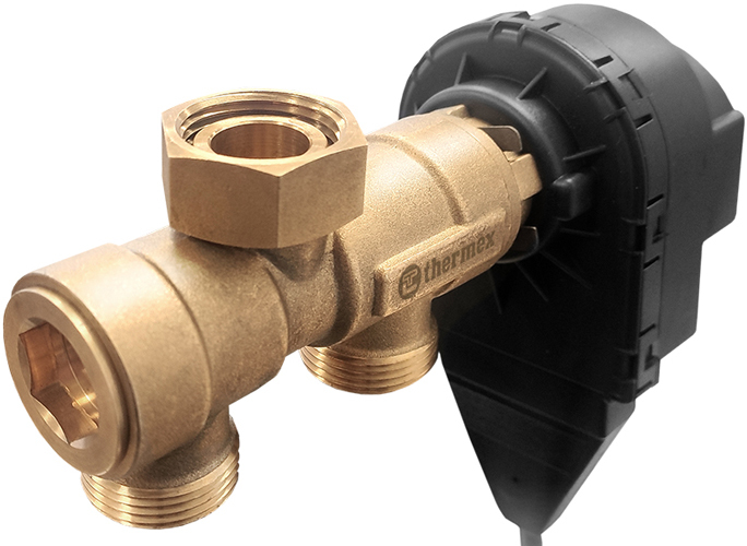 Трехходовый клапан от Thermex (Термекс) dLine T с электроприводом обеспечивает переключение теплоносителя между двух потребителей. Регулировка производится за счет смещения подвижного компонента через электропривод. В качестве направлений используются системы отопления и бойлеры косвенного нагрева.