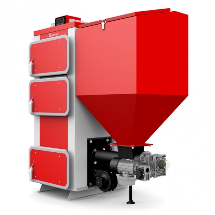 - Котел оснащен автоматическим механизмом шнековой подачи топлива и ретортной горелкой.