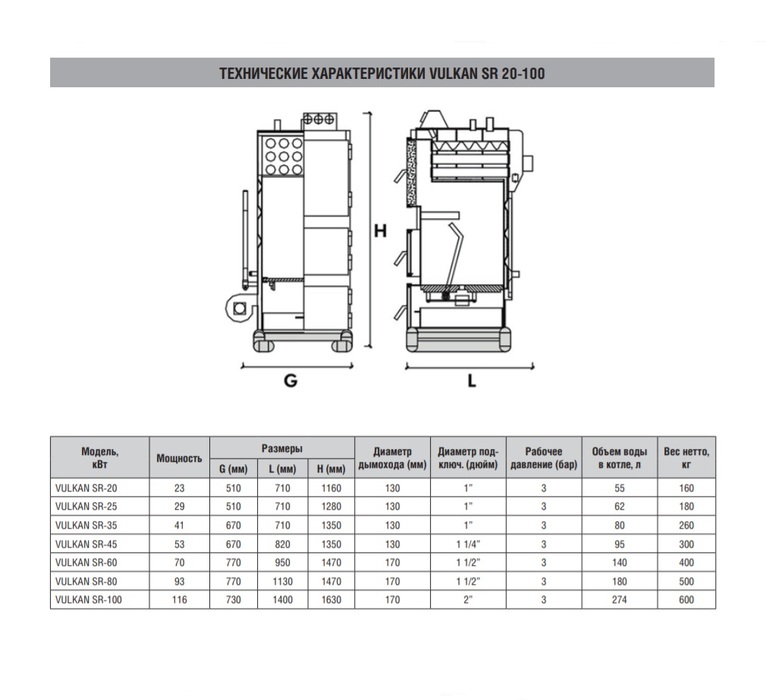 - Котлы SR, Vulkan Max SR могут работать на древесине, угле, топливных брикетах, торфе.