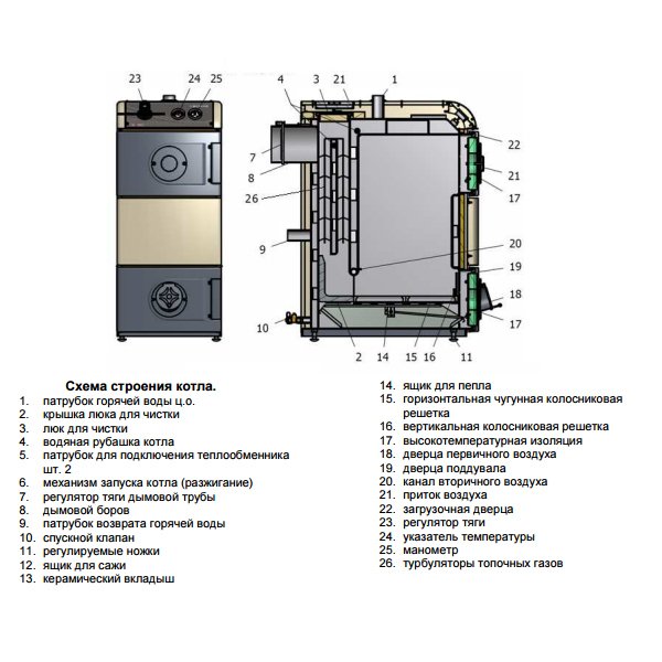 - При необходимости можно применить топливо-заменитель (кокс, брикеты, дрова), без ущерба для высокого КПД.