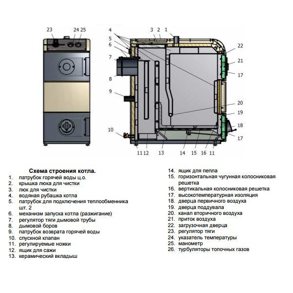 - При необходимости можно применить топливо-заменитель (кокс, брикеты, дрова), без ущерба для высокого КПД.