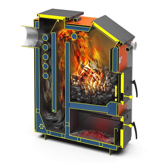- Эффективный теплосъем осуществляется благодаря наличию водотрубных теплообменников и колосников, а также двухшахтной конструкции, имеющую большую площадь контакта с горячими дымовыми газами.