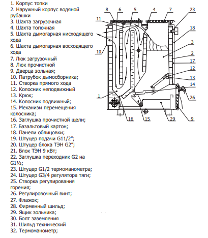 - Блок ТЭН мощностью 9 кВт для поддержания температуры теплоносителя после прогорания топлива.